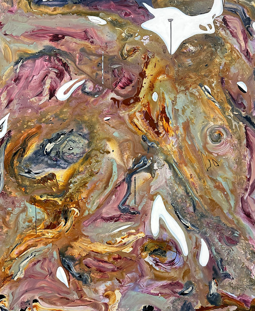 “Le Chercheur d’or” unfolds in strata of earth-like chromatics—ochres, purples, and golds pressed into dense, mineral surfaces, punctuated by white drips that flicker like metallic light. The title, “The Gold Seeker”, suggests the posture of searching for luminosity through mud, opacity, and chaos.